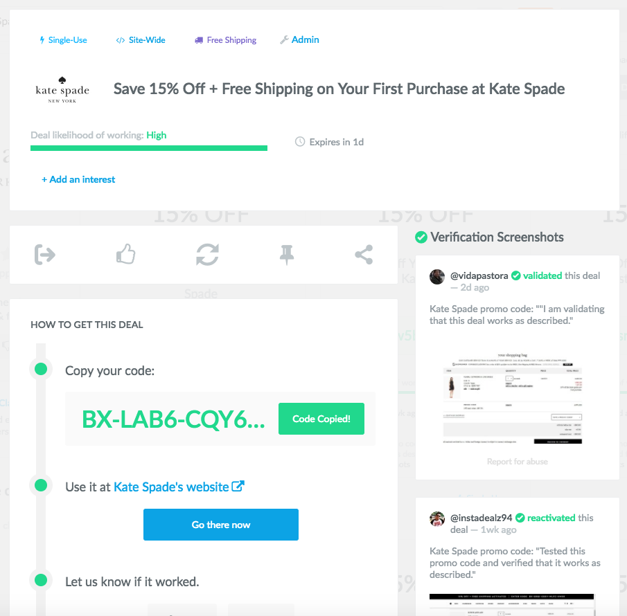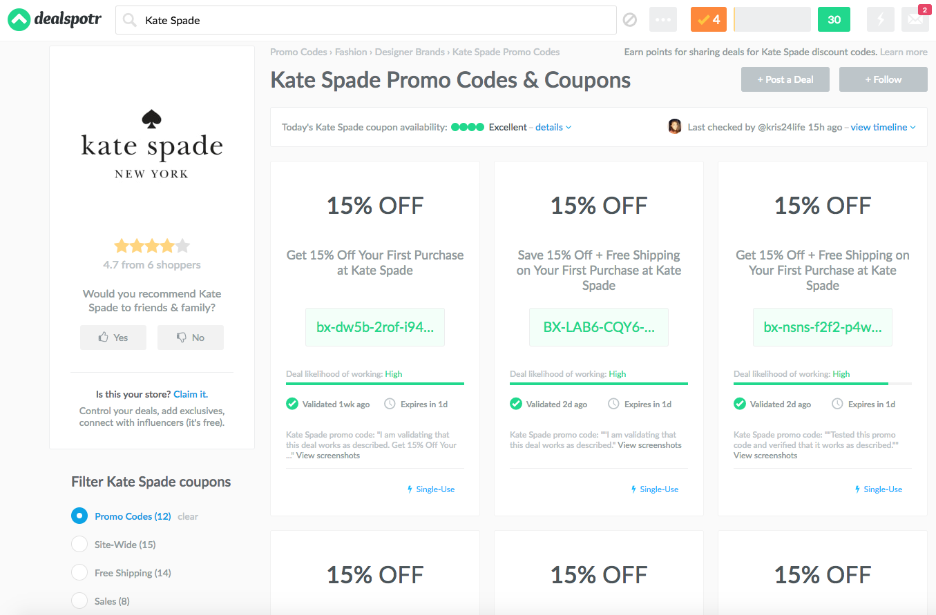 Promo Code? But how do you get one of those? What you need to do is to pop along to a trusted site like Dealspotr and pop in the search box the shops you love to shop at. In this case, I’d look for Kate Spade.